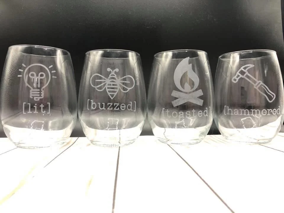 Etched Wine Glasses | [Lit], [Buzzed], [Toasted], [Hammered]